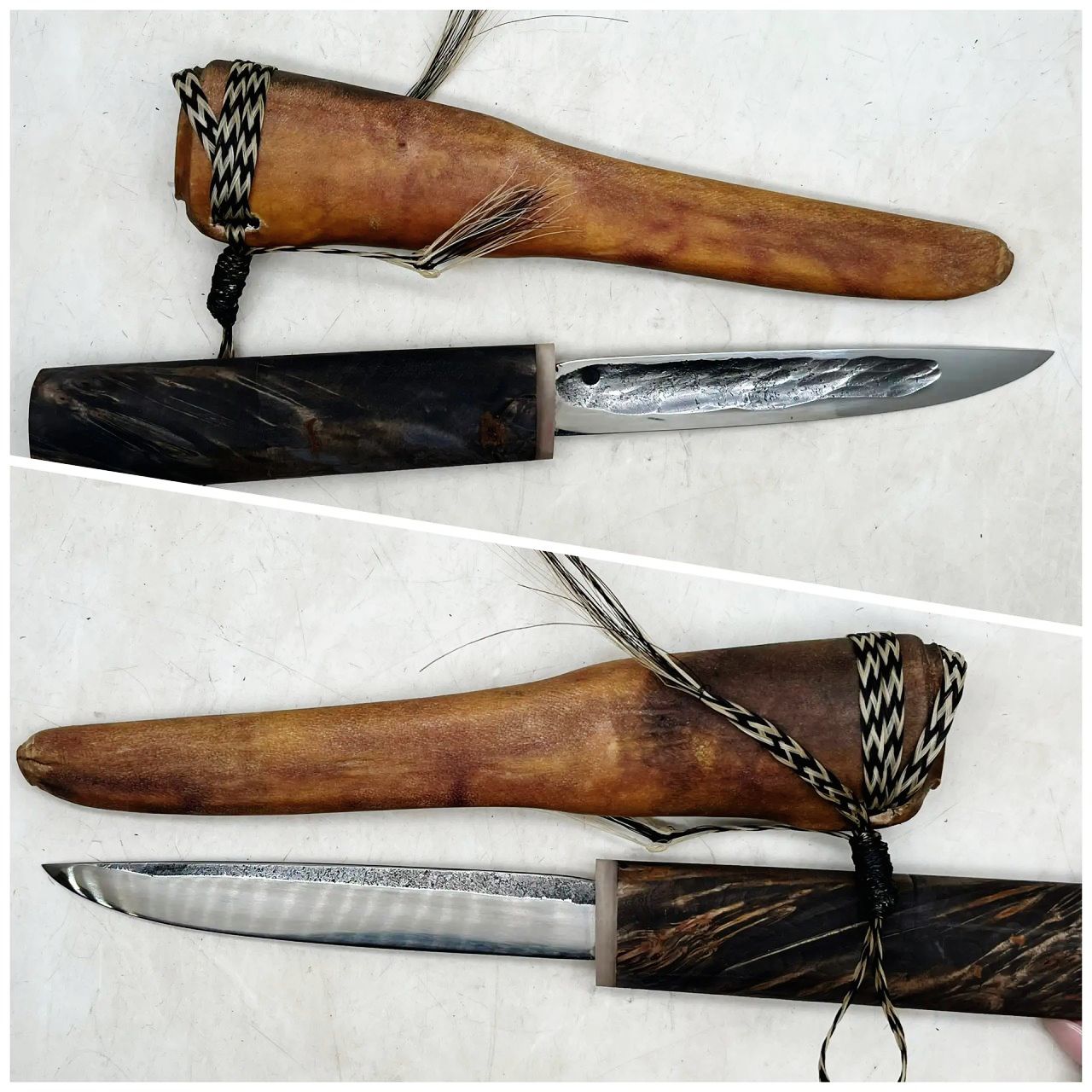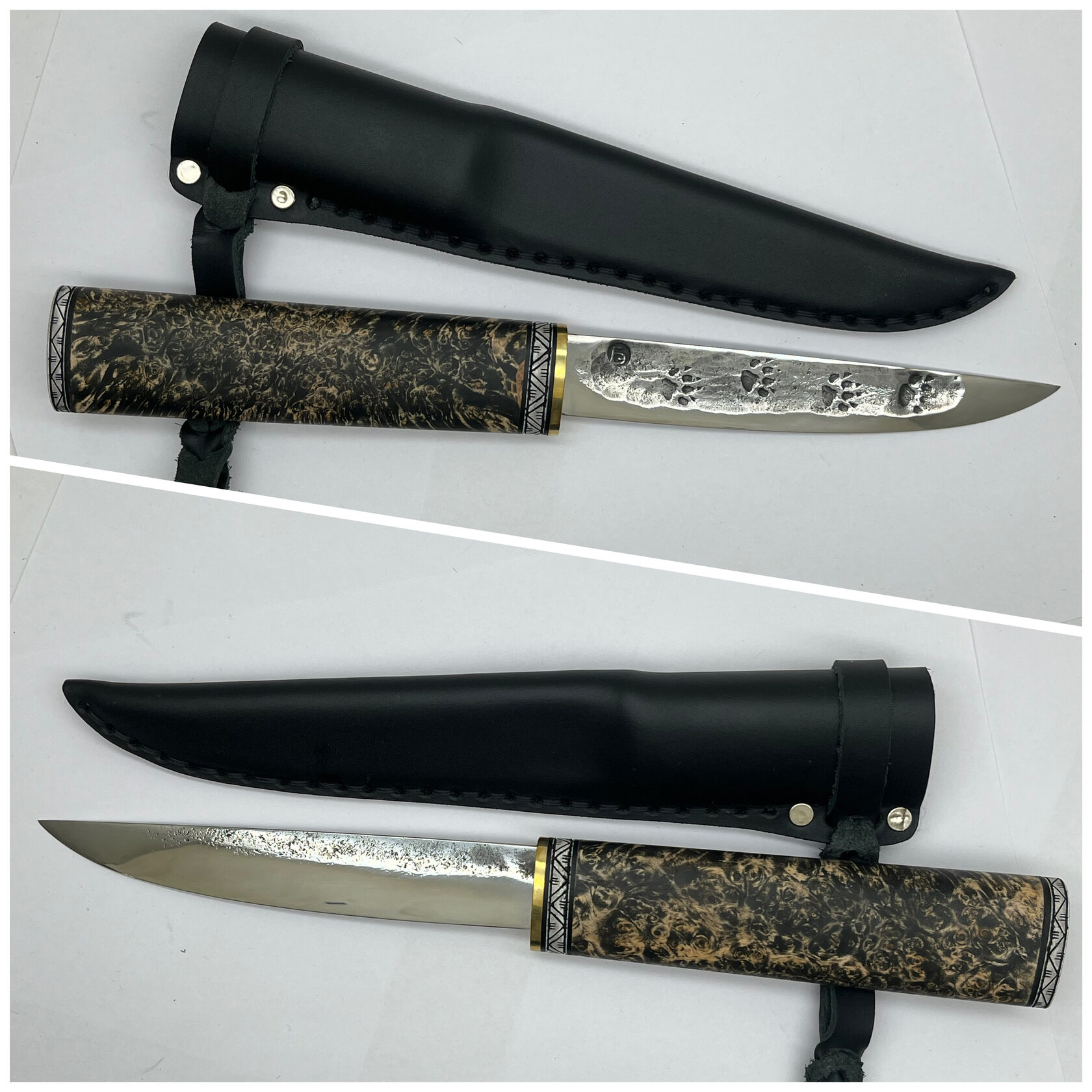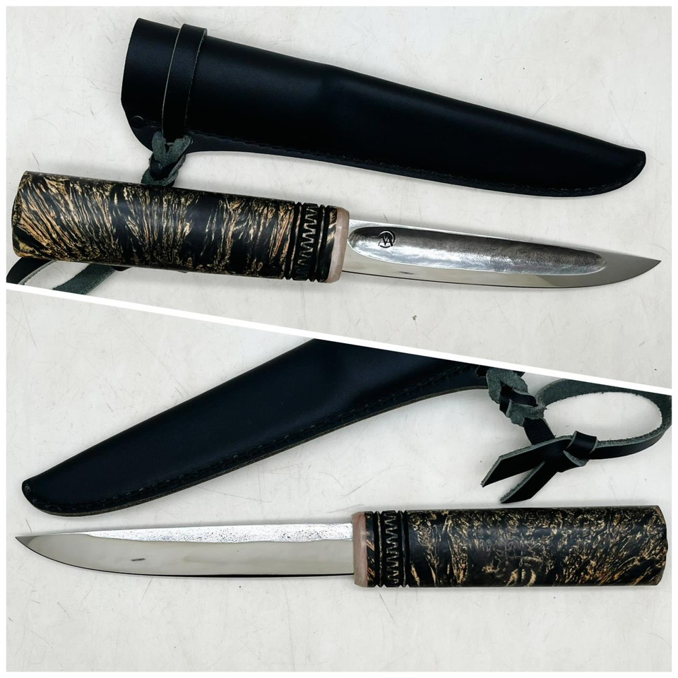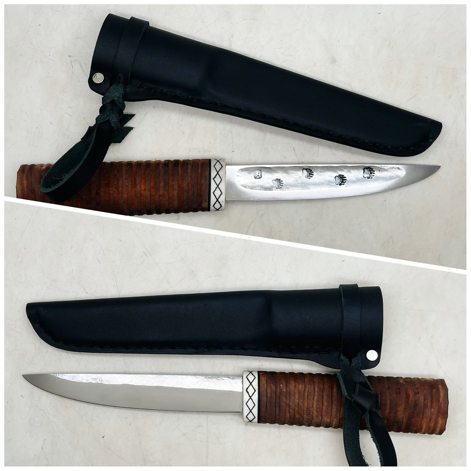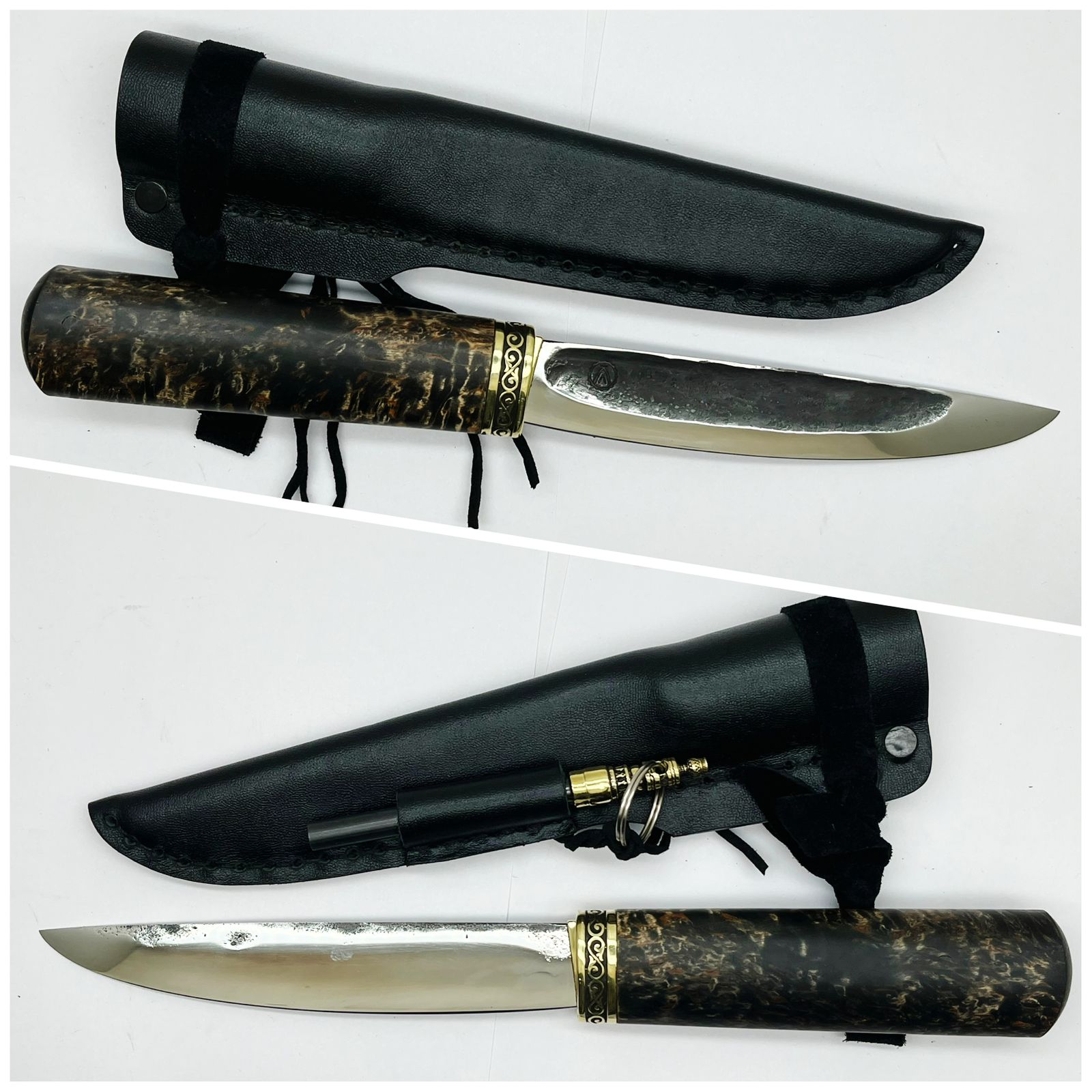 | Яку́тский нож (якут. саха быhаҕа) Уникальные охотничьи якутские ножи ручной работы легко узнаваемы по внешнему виду. Характерная геометрия заостренного клинка с прямым обухом и асимметрической заточкой, деревянная ручка внушительной длины, оригинальный кожаный чехол, декоративная отделка – все это выделяет кованые якутские ножи для охоты. Якутский нож отлично справится с различными задачами охотника от разделки туш до работ с древесиной. Не пропустите возможность купить настоящие якутские ножи от именитых мастеров Якутии. |