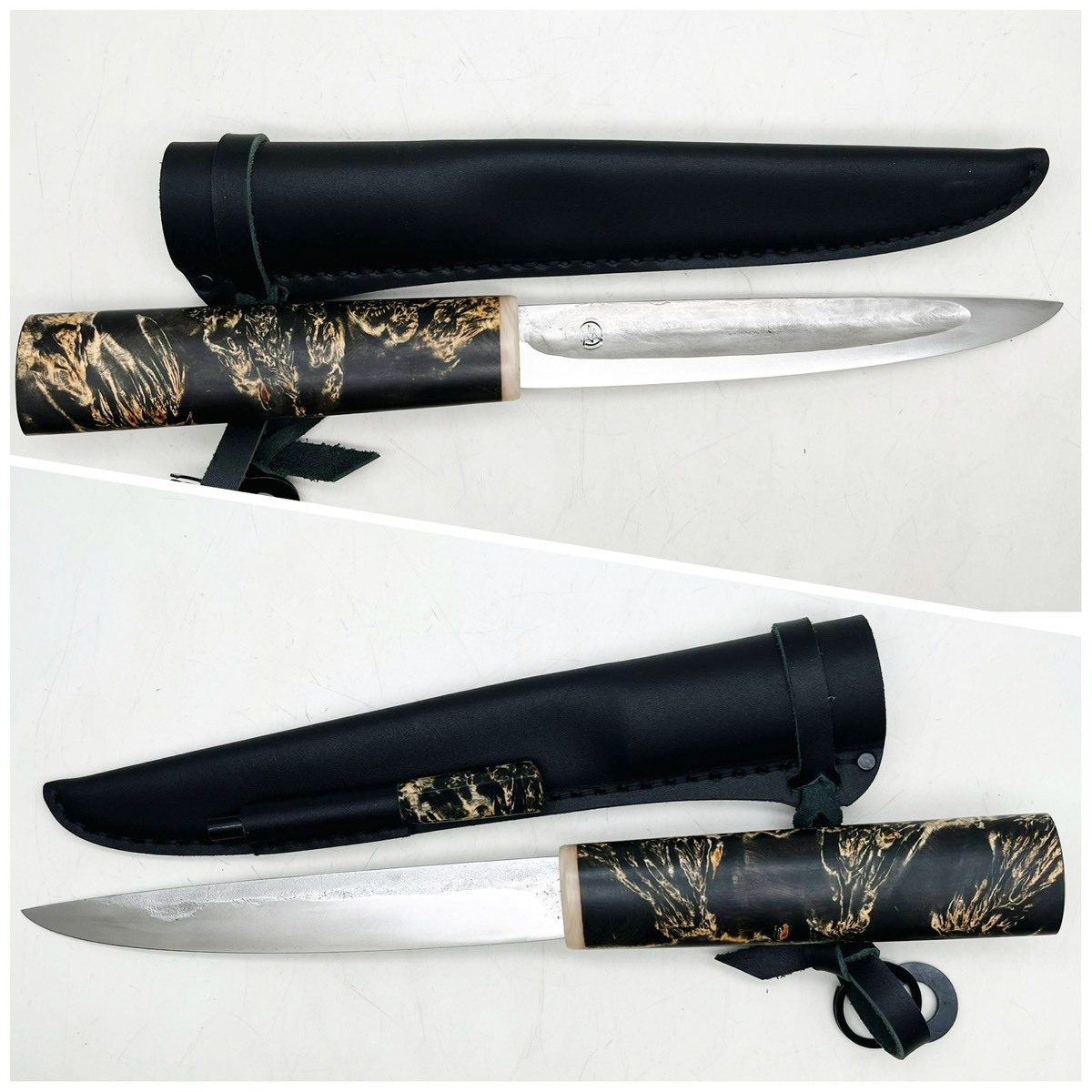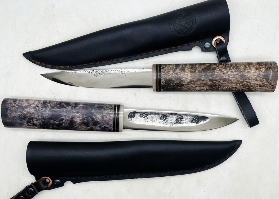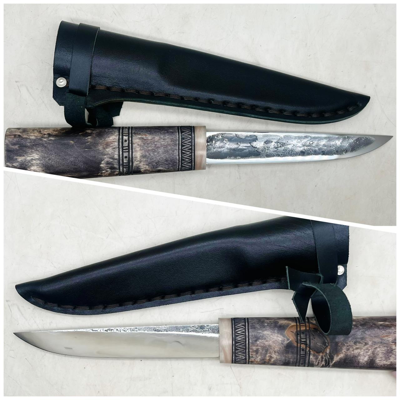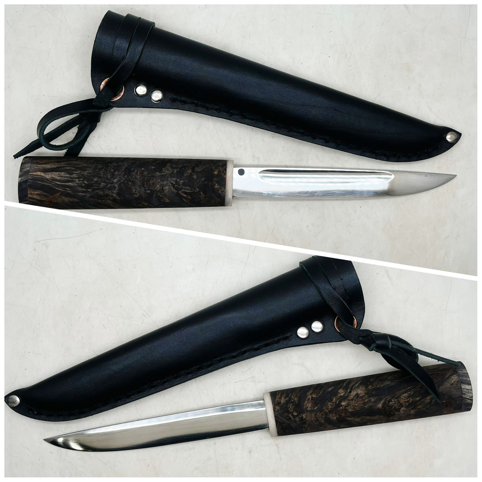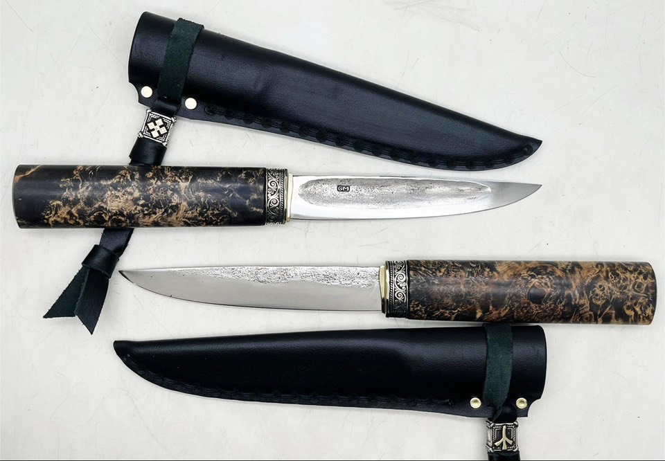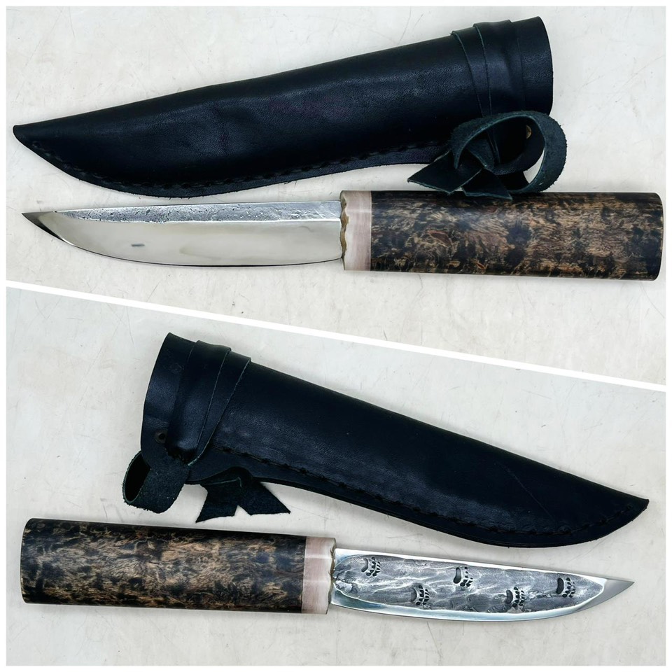 | Яку́тский нож (якут. саха быhаҕа) Уникальные охотничьи якутские ножи ручной работы легко узнаваемы по внешнему виду. Характерная геометрия заостренного клинка с прямым обухом и асимметрической заточкой, деревянная ручка внушительной длины, оригинальный кожаный чехол, декоративная отделка – все это выделяет кованые якутские ножи для охоты. Якутский нож отлично справится с различными задачами охотника от разделки туш до работ с древесиной. Не пропустите возможность купить настоящие якутские ножи от именитых мастеров Якутии. |