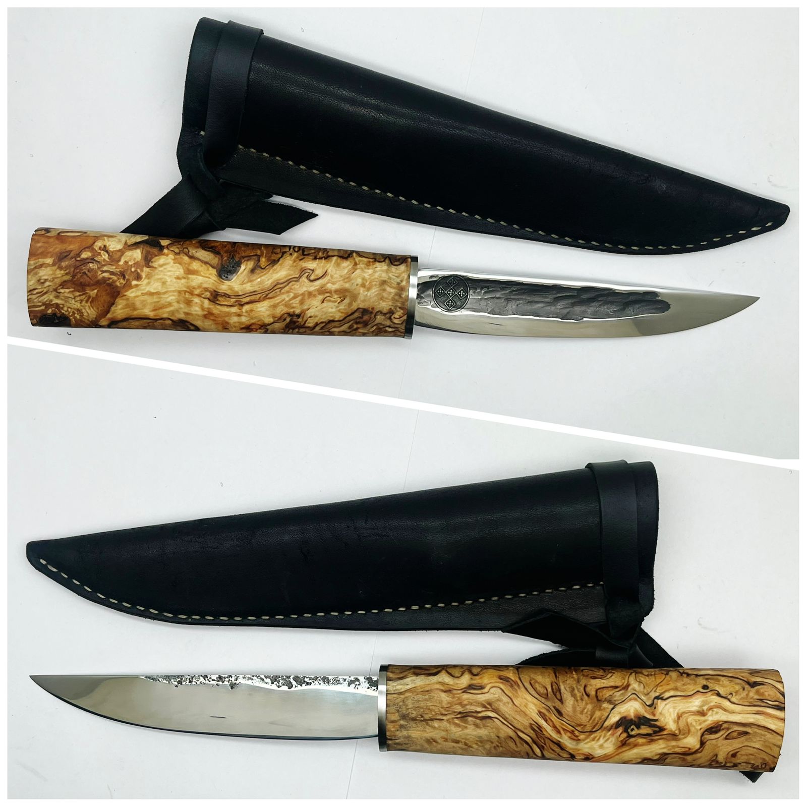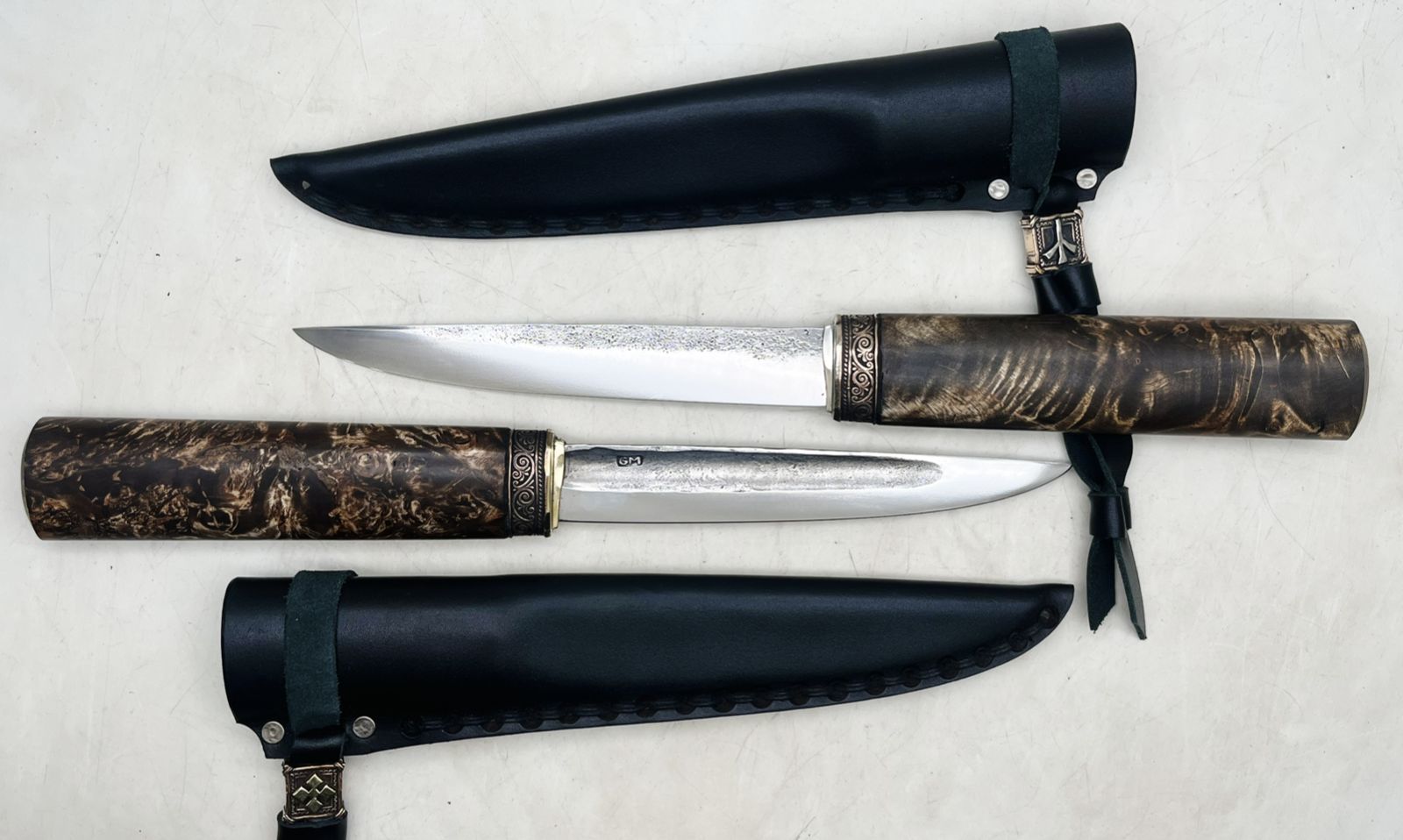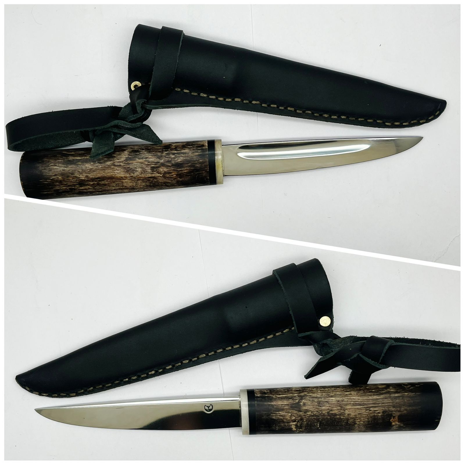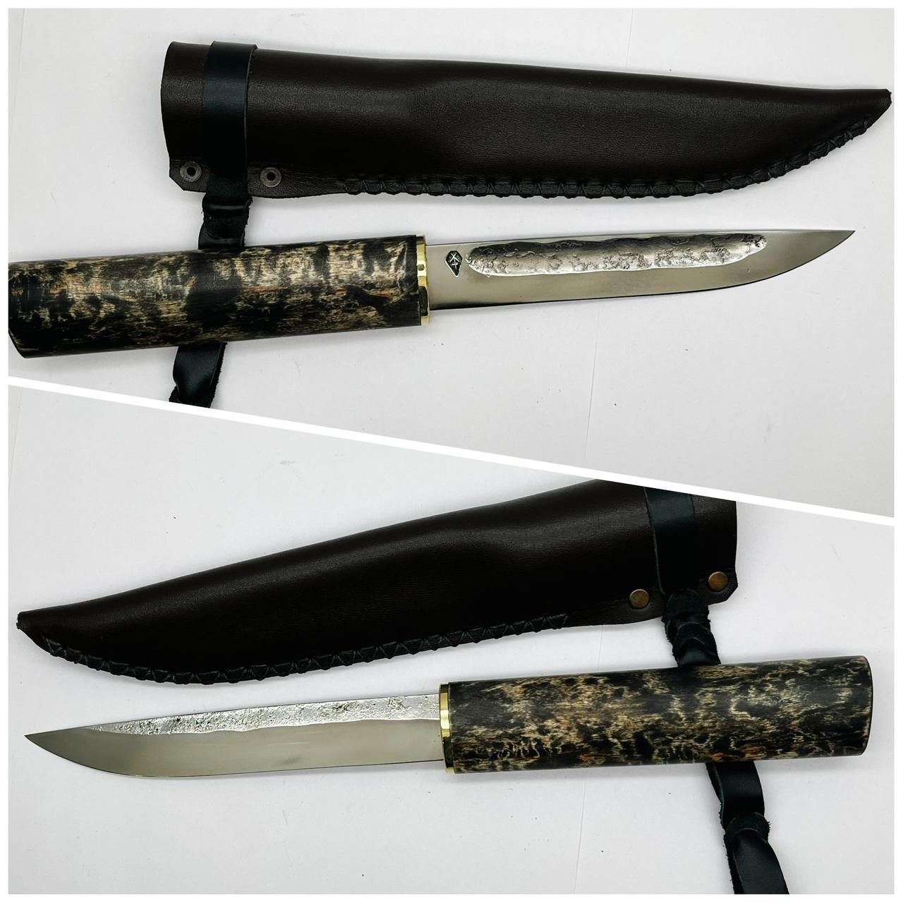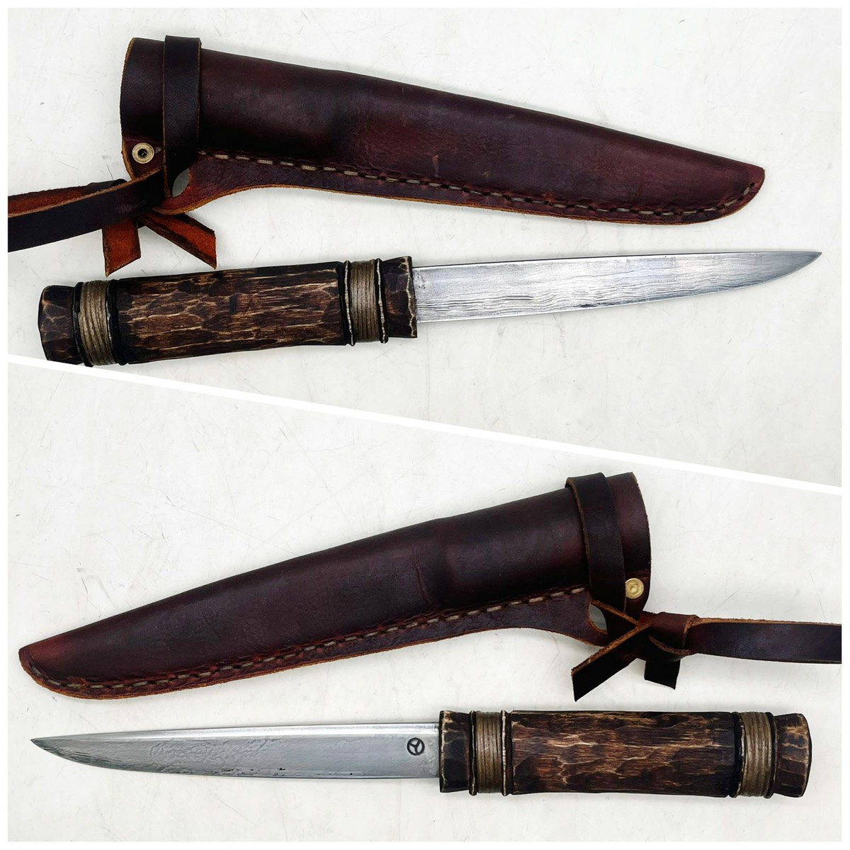 | Яку́тский нож (якут. саха быhаҕа) Уникальные охотничьи якутские ножи ручной работы легко узнаваемы по внешнему виду. Характерная геометрия заостренного клинка с прямым обухом и асимметрической заточкой, деревянная ручка внушительной длины, оригинальный кожаный чехол, декоративная отделка – все это выделяет кованые якутские ножи для охоты. Якутский нож отлично справится с различными задачами охотника от разделки туш до работ с древесиной. Не пропустите возможность купить настоящие якутские ножи от именитых мастеров Якутии. |