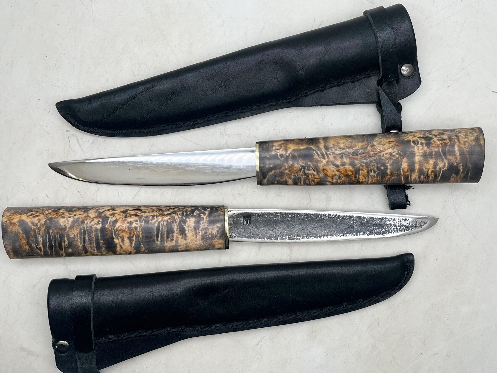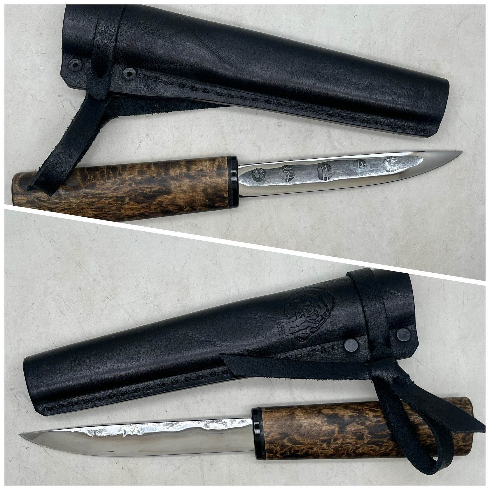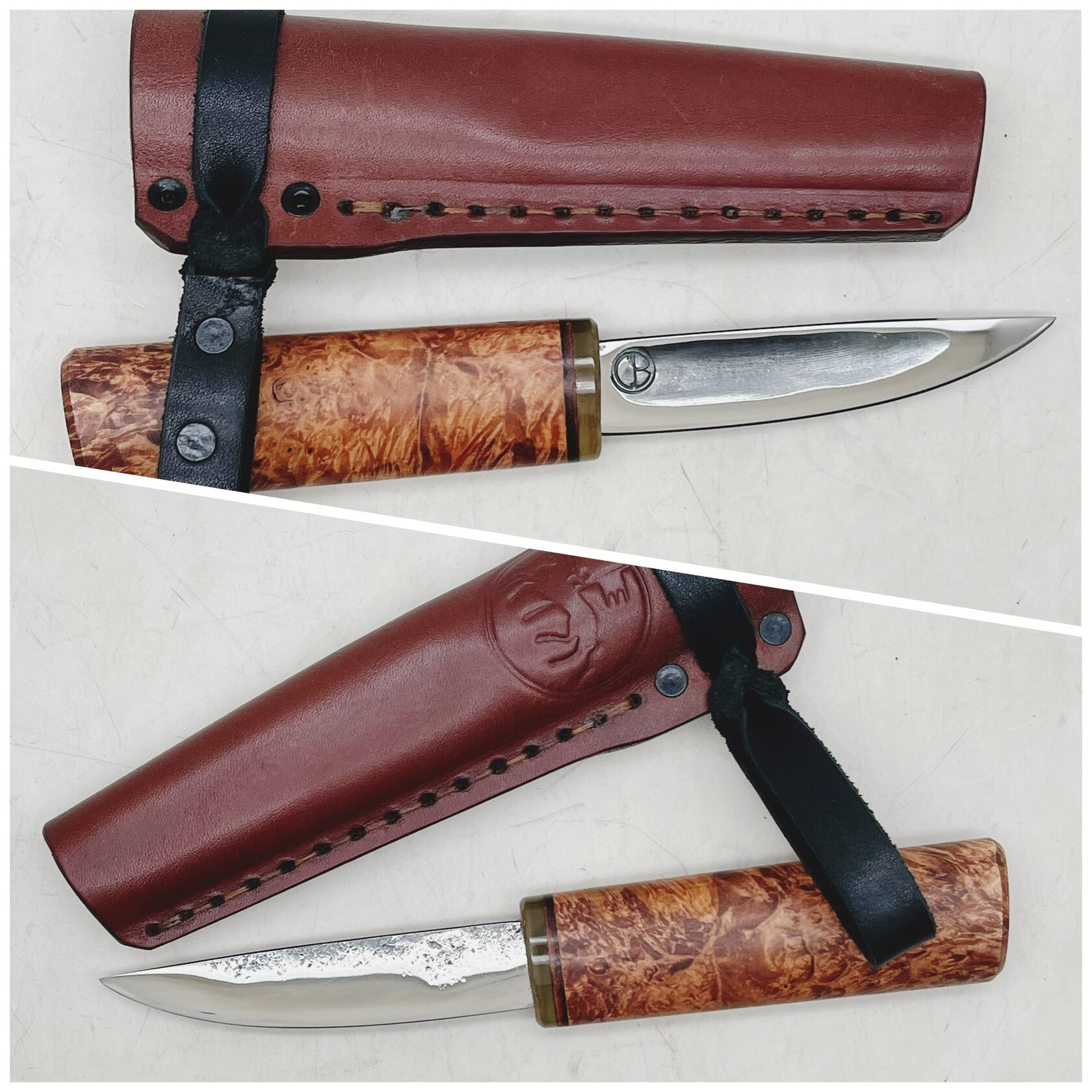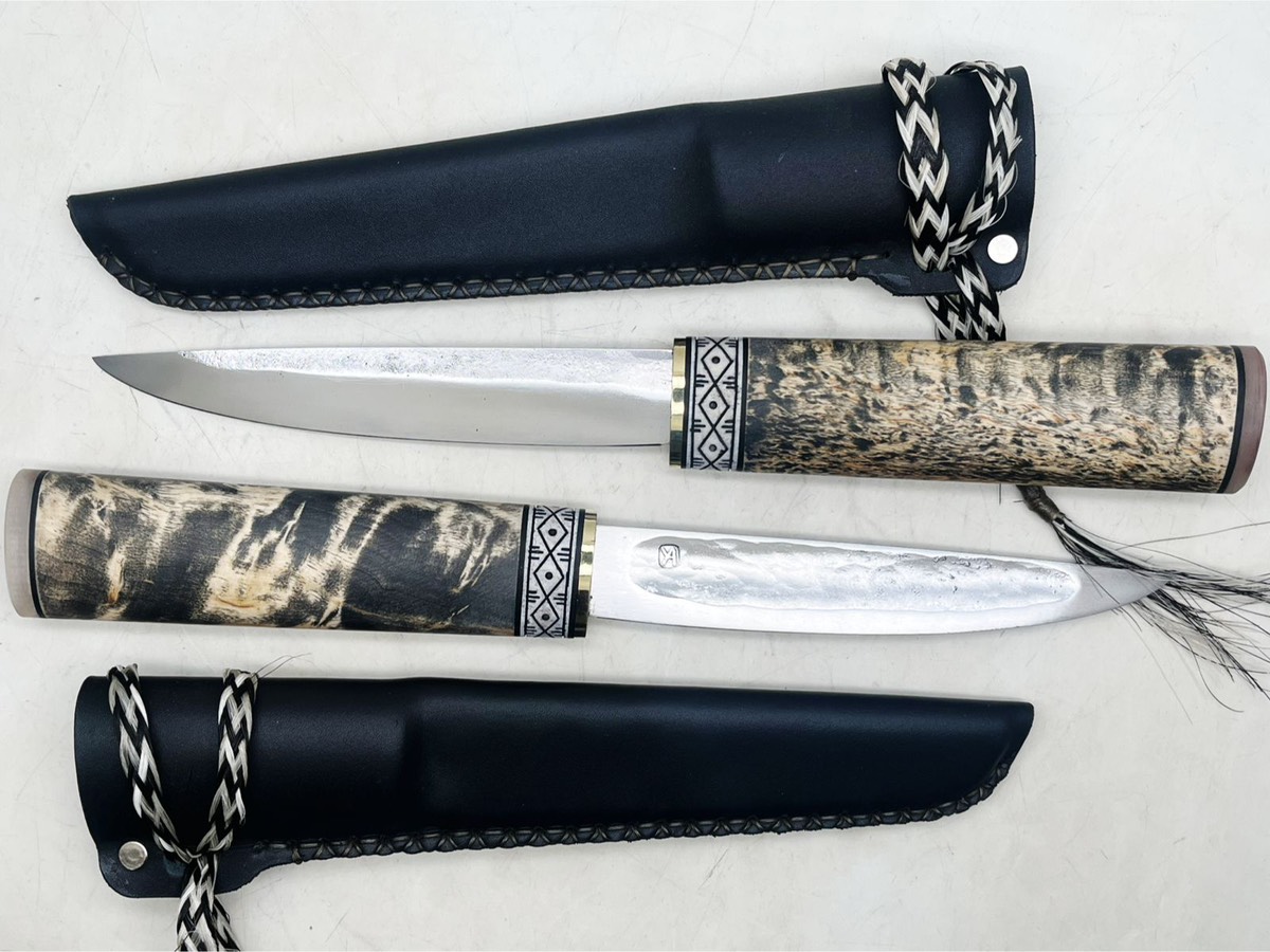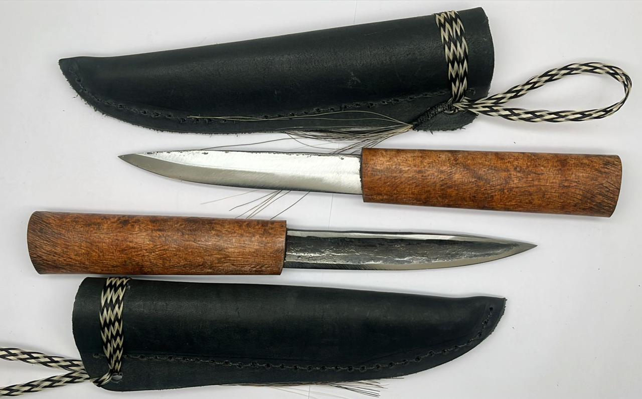 | Яку́тский нож (якут. саха быhаҕа) Уникальные охотничьи якутские ножи ручной работы легко узнаваемы по внешнему виду. Характерная геометрия заостренного клинка с прямым обухом и асимметрической заточкой, деревянная ручка внушительной длины, оригинальный кожаный чехол, декоративная отделка – все это выделяет кованые якутские ножи для охоты. Якутский нож отлично справится с различными задачами охотника от разделки туш до работ с древесиной. Не пропустите возможность купить настоящие якутские ножи от именитых мастеров Якутии. |